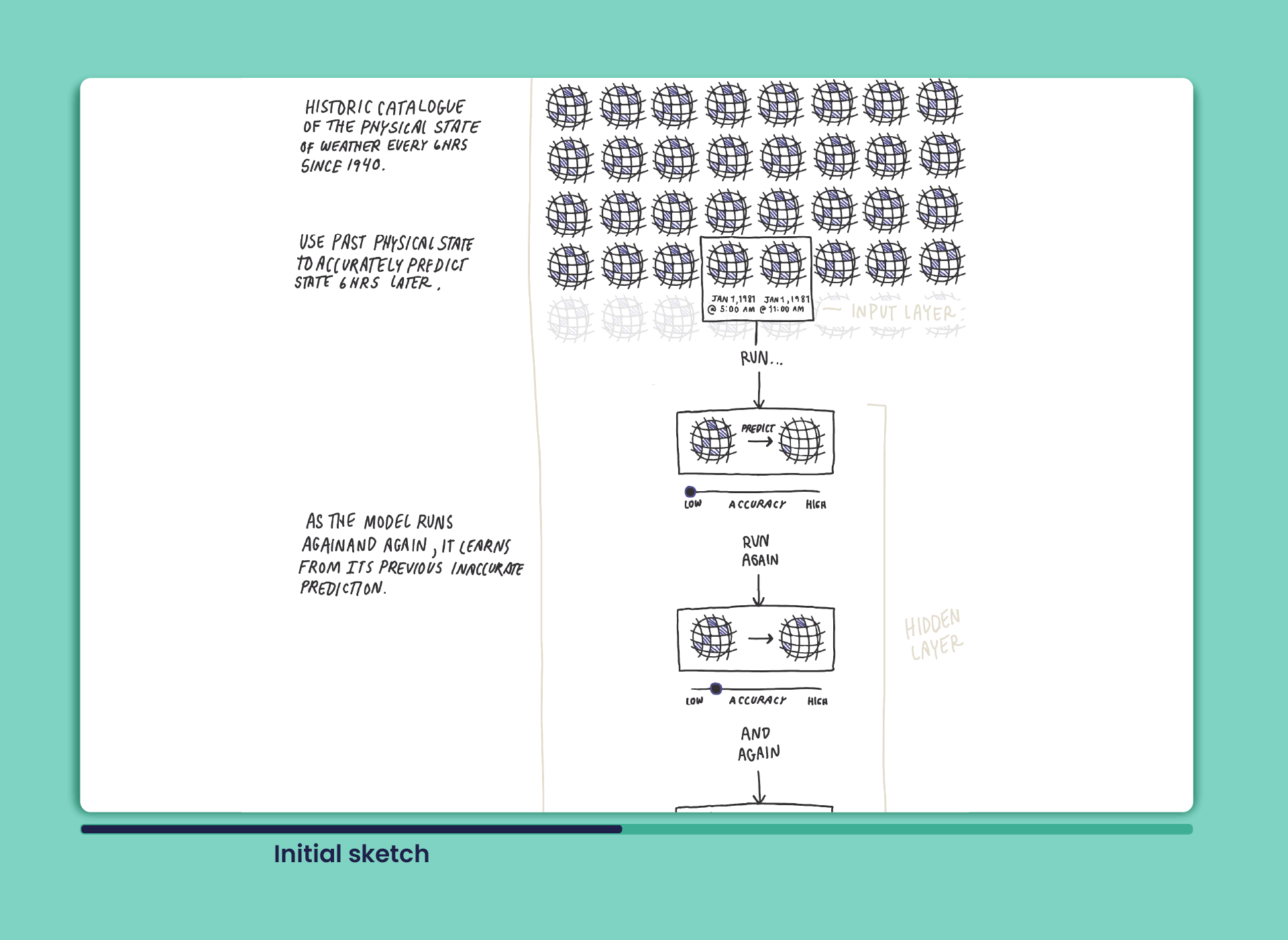 Working closely with ECMWF’s experts, we ran a series of sketch sessions. These allowed us to capture the key details about how this sophisticated AI-driven weather forecasting system works – then distil them into clear, easy-to-understand visuals.